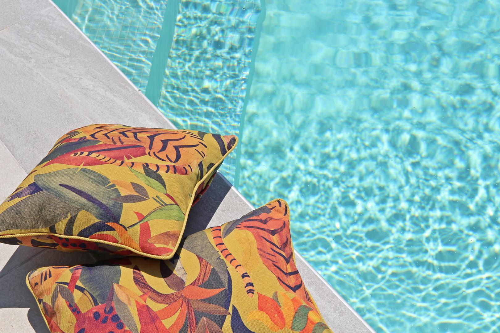The pool is an ideal environment where we boldly played with prints and colors. Argola outdoor living cushions in villa Bella Vita are a perfect combination of sophisticated appearance and high performance, resistant to stains, water and fading, they give cheerful and positive energy to the space in which they are located, proving that there is no need to sacrifice luxury for comfort or durability.